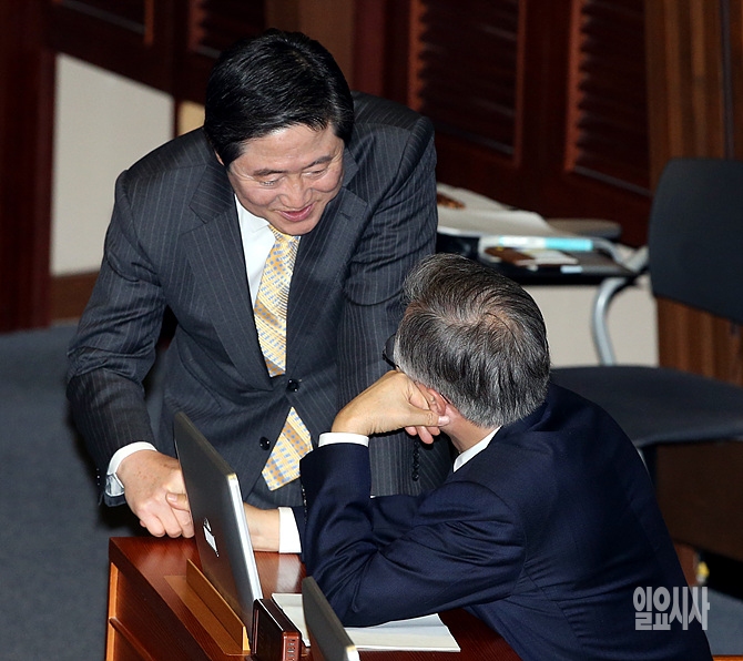 25일, 서울 여의도 국회 본회의장에 열린 첫날 대정부질문 직전, 새누리당 유기준 의원(사진 왼쪽)이 새정치민주연합 문재인 의원과 이야기를 나누고 있다.