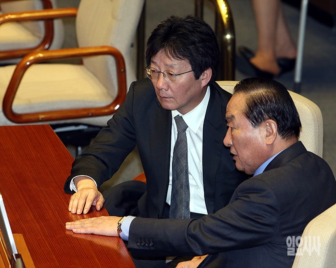25일, 서울 여의도 국회 본회의장에 열린 첫날 대정부질문 직전, 유승민 새누리당 원내대표와 서청원 최고위원이 심각한 표정을 짓고 있다.
