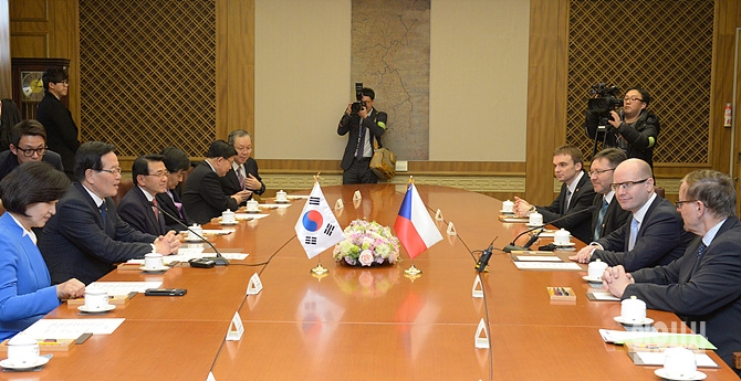 25일, 서울 여의도 국회 의장접결실에서 정의화 국회의장을 예방한 보후슬라프 소보트카 체코 총리가 정 의장과 환담을 나누고 있다.