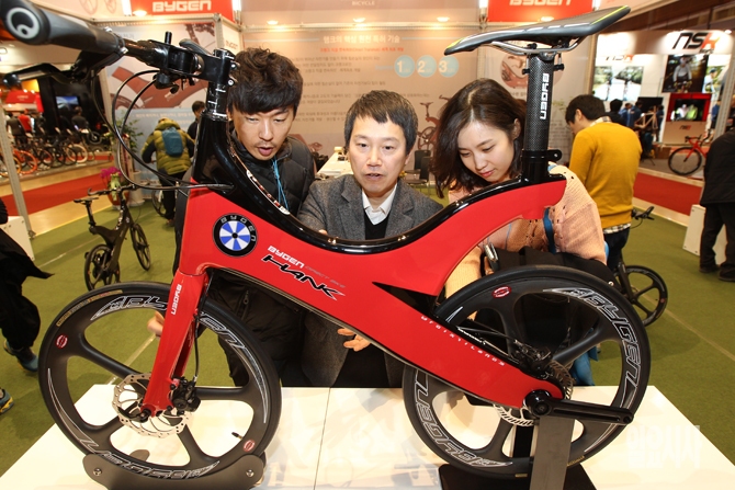 26일 오후 서울 강남구 코엑스에서 열린 '2015 서울국제스포츠레저산업전'에서 자전거 업체 '바이젠'의 관계자가 참관객들에게 상품을 소개하고 있다.