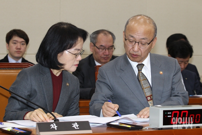 문형표 보건복지부 장관이 26일 서울 여의도 국회에서 열린 보건복지위원회 전체회의에 출석해 장옥주 차관과 논의하고 있다.