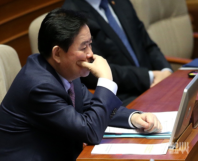 26일, 서울 여의도 국회 본회의장에 출석한 최경환 경제부총리 겸 기획재정부장관이 국회 이틀째 경제분야 대정부질문에 출석해 대기하면서 심각한 표정을 짓고 있다.