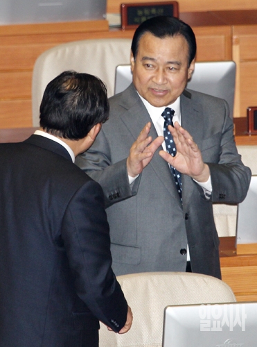 [포토] 동료 의원과 대화 나누는 이완구