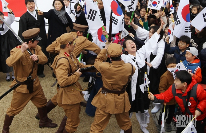 삼일절인 1일 오전 서울 서대문형무소역사관에서 열린 '서대문, 1919 그날의 함성!' 행사에 참여한 시민들이 '대한독립만세'를 외치며 3.1운동을 재현하고 있다.
