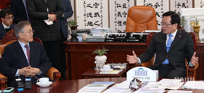 2일 오전, 서울 여의도 국회 의장집무실에서 새정치민주연합 문재인 대표가 정의화 국회의장(사진 오른쪽)과 환담을 나누고 있다.