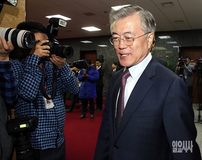 2일 오전, 서울 여의도 국회실에서 열린 새정치민주연합 의원총회에 참석하기 위해 문재인 대표가 의총장 안으로 입장하고 있다.