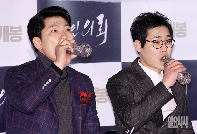 배우 김상경, 김성균이 2일 오후 서울 행당동 CGV 왕십리에서 열린 영화 <살인의뢰> 언론시사회 및 기자회견에서 물을 마시고 있다.