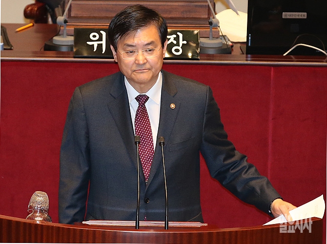 2일, 서울 여의도 국회에서 예산결산위원회 전체회의가 열린 가운데, 서승환 국토교통부 장관이 기관고보를 하고 있다.