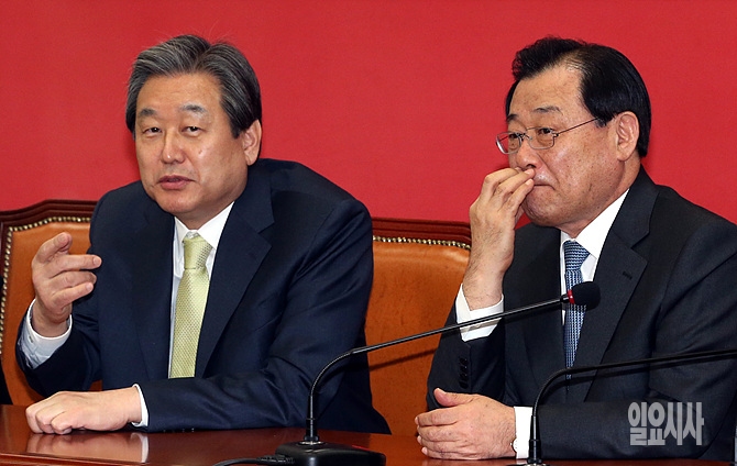 2일, 서울 여의도 국회 새누리당 대표실을 찾은 이병기 신임 대통령실장(사진 오른쪽)이 김무성 대표와 이야기를 나누고 있다.