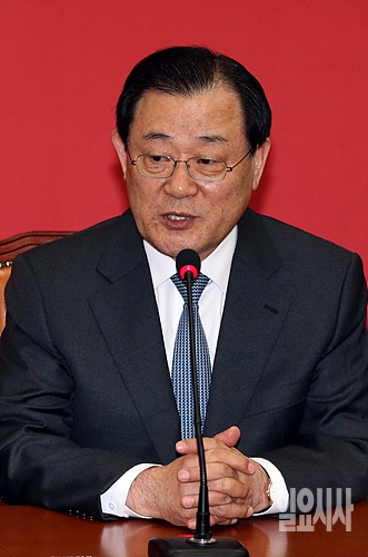 2일, 서울 여의도 국회 새누리당 대표실을 찾은 이병기 신임 대통령실장(사진 오른쪽)이 발언하고 있다.