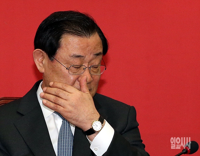 2일, 서울 여의도 국회 새누리당 대표실을 예방한 이병기 신임 대통령실장(사진 오른쪽)이 김무성 대표 등 지도부와 이야기 도중 잠시 눈을 감고 있다.