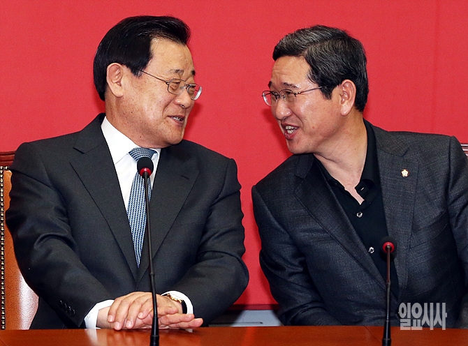 2일, 서울 여의도 국회 새누리당 당대표실을 찾은 이병기 신임 대통령실장(사진 왼쪽)이 김학용 대표 비서실장과 화기애애한 분위기로 이야기를 나누고 있다.