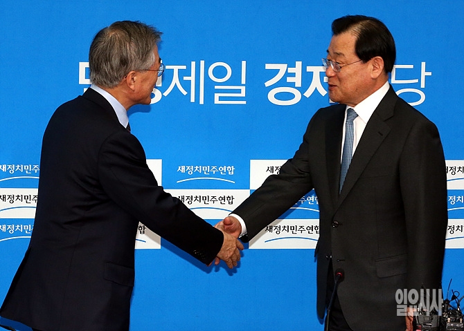 2일, 이병기 신임 대통령실장이 서울 여의도 국회 새정치민주연합 당대표실을 찾아 문재인 대표를 예방하고 악수를 나누고 있다.