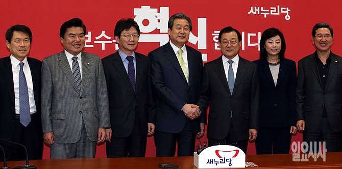 2일, 이병기 신임 대통령실장(사진 오른쪽서 세 번째), 조윤선 민정수석(사진 오른쪽서 두 번째)이 서울 여의도 국회 새누리당 당대표실을 찾아 김무성 대표(사진 가운데) 등 지도부와의 회동에서 악수를 나누고 있다.