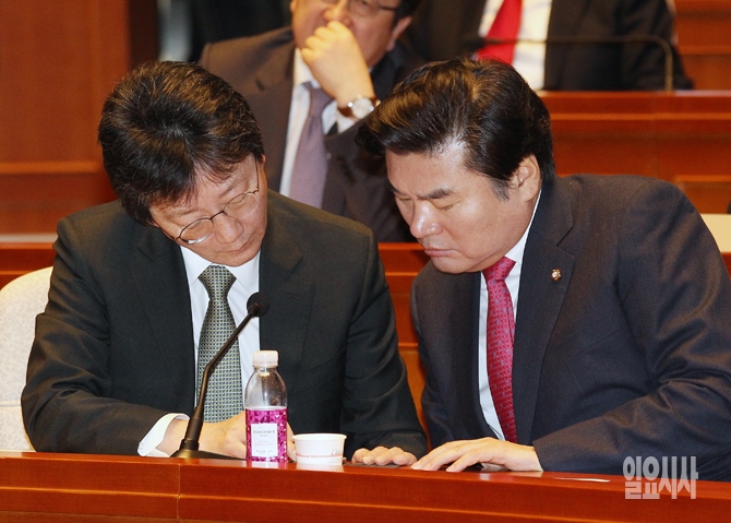새누리당 유승민 원내대표, 원유철 정책위의장이 3일 오전 서울 여의도 국회에서 열린 새누리당 의원총회에 참석의원들과 대화를 나누고 있다.