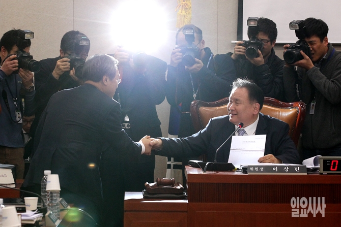 3일 오후 서울 여의도 국회 법사위 회의실에서 열린 법제사법위원회 전체회의에서 '김영란법(부정청탁 및 금품 등 수수의 금지에 관한 법률 제정안)' 이 통과되자 우윤근 새정치민주연합 원내대표와 이상민 위원장이 악수를 하고 있다.