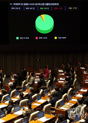 3일, 서울 여의도 국회 본회의장에서 김영란법(부정청탁 및 금품 등 수수의 금지에 관한 법률)이 2년8개월만에 재석의원 247명 중 반대 4명, 기권 17명, 찬성 226명으로 국회 본회의를 통과하고 있다.
