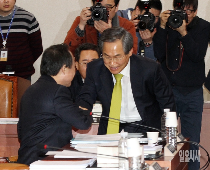 새누리당 홍일표 여당 간사(왼쪽)와 새정치민주연합 우윤근 원내대표가 3일, 국회 법제사법위원회에서 '김영란법'이 통과되자 서로 악수를 하고 있다.