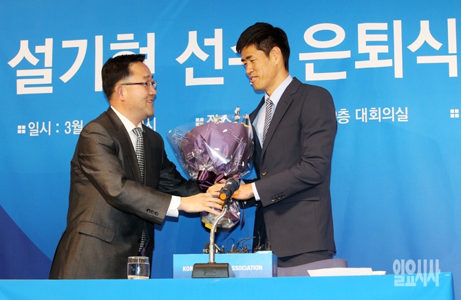 축구선수 설기현이 4일 오전 서울 신문로 축구회관에서 열린 자신의 선수 은퇴 기자회견에서 김학범 인천유나이티드 사무국장에게 꽃다발을 받고 있다. 선수 유니폼을 벗은 설기현은 성균관대 축구부 감독으로 새인생을 시작할 예정이다.