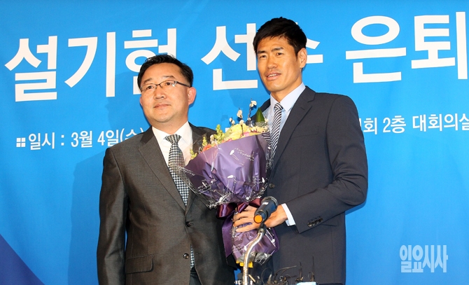 축구선수 설기현(오른쪽)이 4일 오전 서울 신문로 축구회관에서 열린 자신의 선수 은퇴 기자회견에서 김학범 인천유나이티드 사무국장에게 꽃다발을 전달받은 뒤 사진촬영을 하고 있다. 선수 유니폼을 벗은 설기현은 성균관대 축구부 감독으로 새인생을 시작할 예정이다.