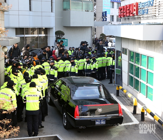 마크 리퍼트 주한 미국대사가 민족화해협력범국민협회 초청 조찬 강연에 참석했다가 괴한의 테러를 당한 5일 오전 경찰들이 서울 종로구 강북삼성병원에서 대기 중이던 외교부 차량 주변 경계근무를 서고 있다.