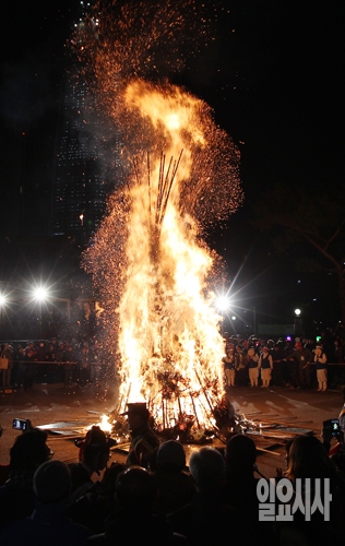 정월 대보름인 5일 저녁 서울 송파구 잠실 서울놀이마당에서 열린 대보름 행사에서 달집태우기가 진행되고 있다.