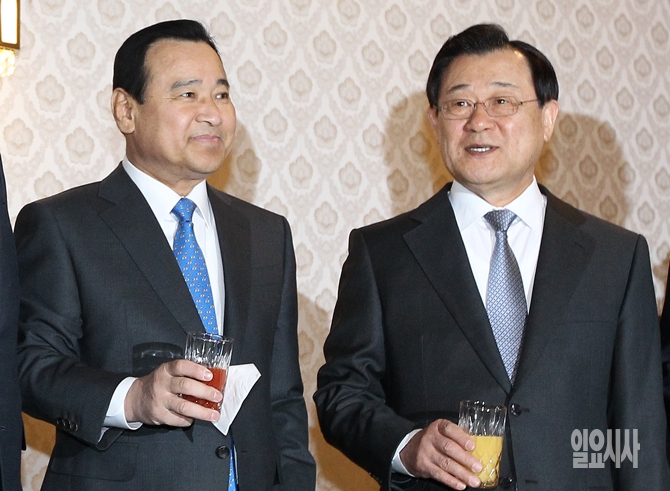 이완구 국무총리(왼쪽)와 이병기 신임 청와대 비서실장이 6일 오전 서울 삼청동 국무총리 공관에서 열린 고위 당정청 회의에 앞서 차담을 나누고 있다.