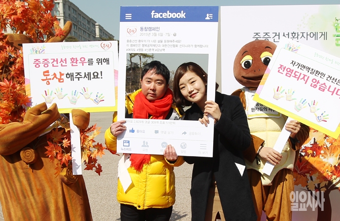 6일 오후 서울 여의도공원에서 열린 행복공학재단 프리허그 '중증건선 환자에게 봄을' 행사에서 한 시민이 건선 환우와 사진을 찍고 있다. 건선은 피부 표피의 과도한 증식과 진피의 염증이 만성적으로 나타나는 자가면역질환으로 전염성은 없지만 피부에 증상이 나타나 사회생활에 제약을 많이 받는다.