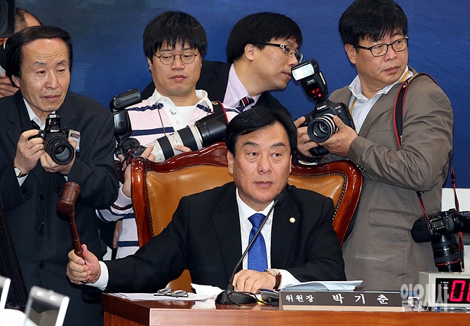 9일, 서울 여의도 국회에서 유일호 국토교통부장관 후보자에 대한 인사청문회가 열린 가운데, 박기춘 인사청문위원장이 의사봉을 두드리고 있다.