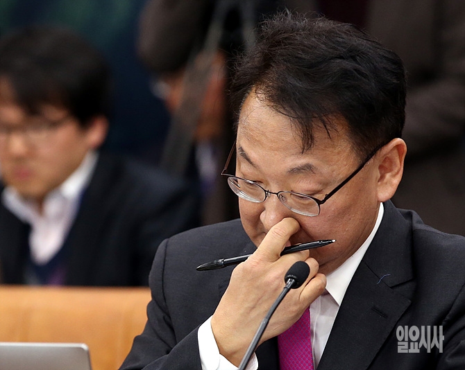 9일, 서울 여의도 국회에서 유일호 국토교통부장관 후보자에 대한 인사청문회에서 유 후보자가 청문위원들의 질의에 잠시 고민에 빠져 있다.