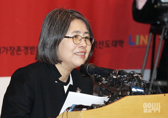김영란 전 국민권익위원장이 10일 오전 서울 마포구 서강대 다산관에서 '김영란법'(부정청탁 및 금품 등의 수수금지법)을 둘러싼 논란에 대해 기자회견을 열고 입장을 밝히고 있다.