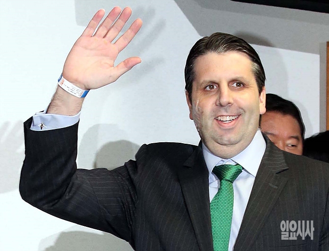 10일, 서울 서대문구에 위치한 신촌세브란스 병원에서 마크 리퍼트 주한미국대사가 퇴원 직전, 피습사건과 관련한 기자회견에서 성원에 손인사로 답례하고 있다.