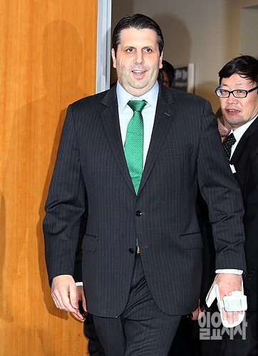 10일, 서울 서대문구에 위치한 신촌세브란스 병원에서 마크 리퍼트 주한미국대사가 퇴원 직전, 피습사건과 관련해 기자회견을 갖기 위해 밝은 표정으로 회견장 안으로 입장하고 있다.