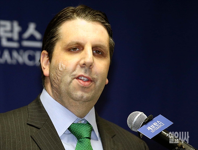 10일, 서울 서대문구에 위치한 신촌세브란스 병원에서 마크 리퍼트 주한미국대사가 퇴원 직전, 피습사건과 관련해 다소 여유로운 표정으로 기자회견을 갖고 있다.