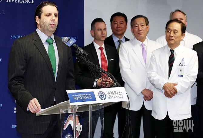10일, 서울 서대문구에 위치한 신촌세브란스 병원에서 마크 리퍼트 주한미국대사가 퇴원 직전, 피습사건과 관련해 기자회견을 갖고 있는 가운데, 세브란스 병원 의료진이 안도의 표정을 짓고 있다.