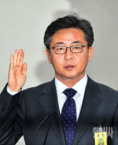 11일, 서울 여의도 국회에서 홍용표 통일부장관 후보자에 대한 인사청문회가 열린 가운데, 홍 후보자가 인사청문회 직전 성실한 답변을 하겠다며 선서하고 있다.