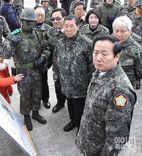 11일, 황진하 국회 국방위원장(사진 가운데)이 한·미연합 FARP(전방지역 무장 장착 및 급유) 훈련이 실시되고 있는 경기도 이천 항공작전사령부를 방문해 관계자로부터 작전 상황에 대해 보고받고 있다. (국회사진기자단)