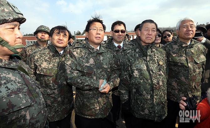 11일, 황진하 국회 국방위원장 등이 한·미연합 FARP (전방지역 무장 장착 및 급유) 훈련이 실시되고 있는 경기도 이천 항공작전사령부를 방문해 상황보고를 받고 있다. (국회사진기자단)