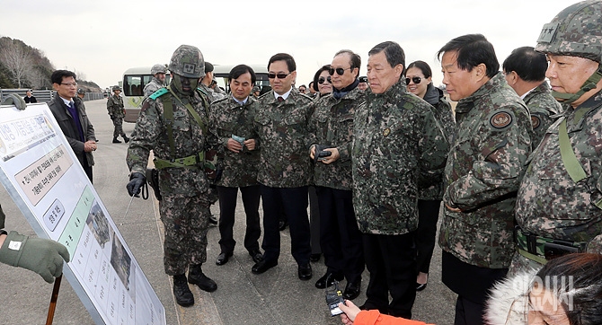 11일, 황진하 국회 국방위원장 등이 한·미연합 FARP (전방지역 무장 장착 및 급유) 훈련이 실시되고 있는 경기도 이천 항공작전사령부를 방문해 상황보고를 받고 있다. (국회사진기자단)