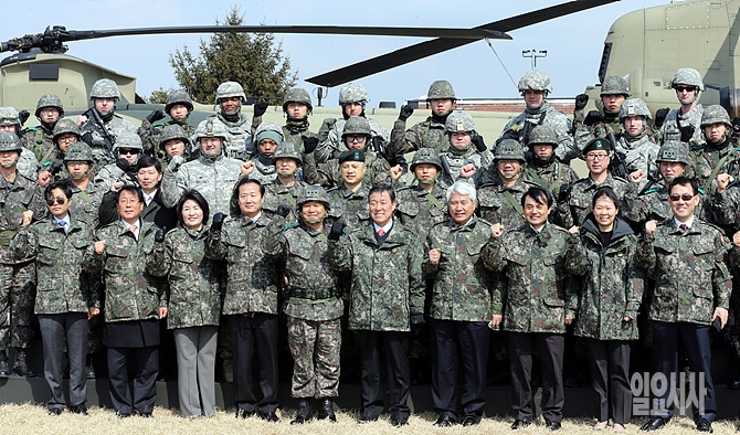 11일, 황진하 국회 국방위원장 등이 한·미연합 FARP (전방지역 무장 장착 및 급유) 훈련이 실시되고 있는 경기도 이천 항공작전사령부를 방문해 파이팅을 외치고 있다. (국회사진기자단)