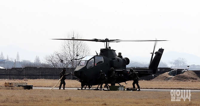 11일, 황진하 국회 국방위원장 등이 한·미연합 FARP (전방지역 무장 장착 및 급유) 훈련이 실시되고 있는 경기도 이천 항공작전사령부를 방문한 가운데, 한 장병이 아파치 헬기에 급유시범을 보이고 있다. (국회사진기자단)