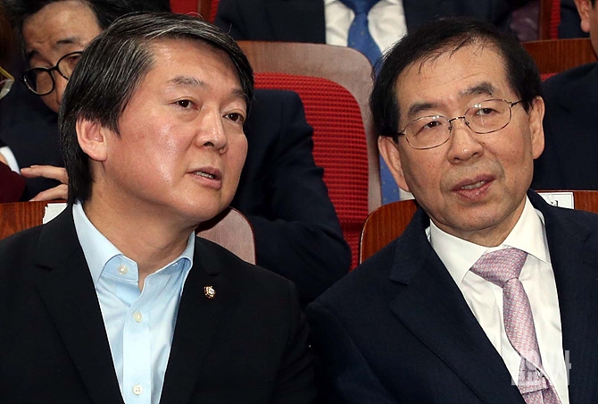 11일, 서울 여의도 국회 의원회관에서 열린 '더미래연구소 창립식 및 창립기념 토론회'에서 안철수 새정치민주연합 의원(사진 왼쪽)과 박원순 서울시장이 잠시 이야기를 나누고 있다.