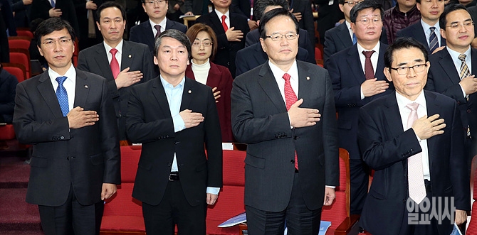 11일, 서울 여의도 국회 의원회관에서 열린 '더미래연구소 창립식 및 창립기념 토론회' 직전, 정의화 국회의장(사진 오른쪽서 두 번째), 새정치민주연합 안철수 의원(사진 왼쪽서 두 번째), 안희정 충남도지사(사진 왼쪽) 등이 국기에 대한 경례를 하고 있다.