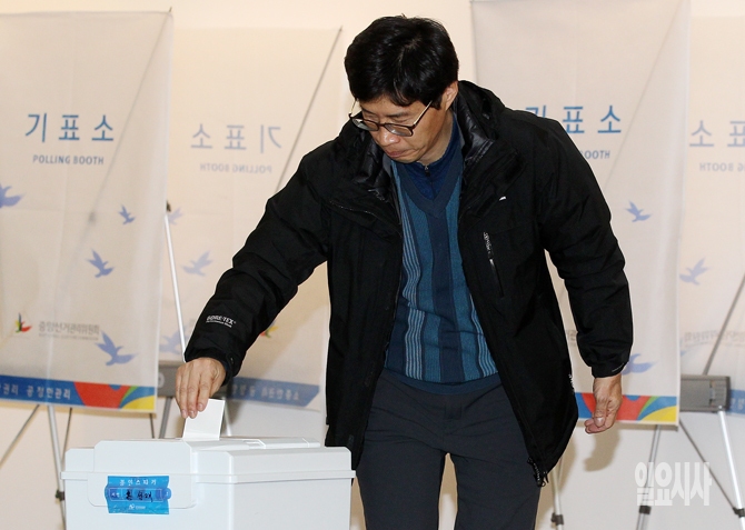 제1회 전국동시조합장 선거일인 11일 서울 천호동 강동구민회관에 설치된 투표소에서 한 조합원이 투표에 참여하고 있다.