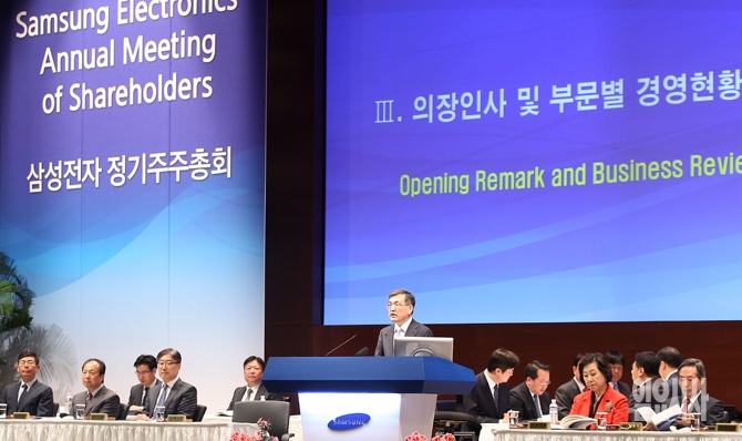 권오현 삼성전자 대표이사 부회장이 13일 오전 서울 서초동 삼성전자 본사에서 열린 삼성전자 정기주주총회에 참석해 인사말을 하고 있다.