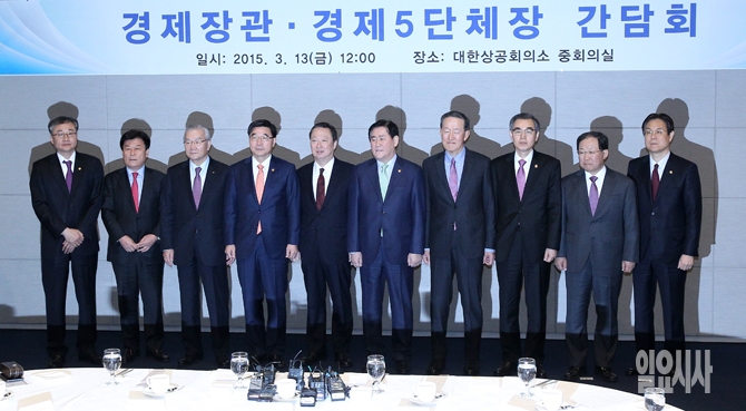 13일 오후 서울 남대문로 대한상공회의소에서 열린 '경제장관·경제5단체장 간담회'에서 참석자들이 기념촬영을 하고 있다. 왼쪽부터 박성택 중소기업중앙회장, 김인호 한국무역협회장, 이기권 고용노동부 장관, 박용만 대한상공회의소 회장, 최경환 경제부총리, 허창수 전국경제인연합회장, 정재찬 공정위원장, 박병원 한국경총 회장, 이관섭 산업부 차관.