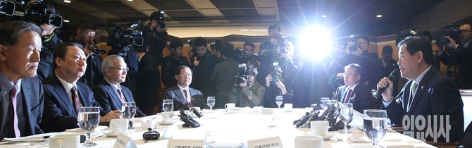 최경환 경제부총리(맨 오른쪽)가 13일 오후 서울 남대문로 대한상공회의소에서 열린 '경제장관·경제단체장 간담회'에 참석해 모두발언을 하고 있다.