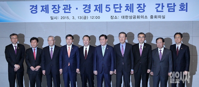 13일 오후 서울 남대문로 대한상공회의소에서 열린 '경제장관·경제단체장 간담회'에서 참석자들이 기념촬영을 하고 있다. 왼쪽부터 정찬우 금융위원회 부위원장, 박성택 중소기업중앙회장, 김인호 한국무역협회장, 이기권 고용노동부 장관, 박용만 대한상공회의소 회장, 최경환 경제부총리, 허창수 전국경제인연합회장, 정재찬 공정위원장, 박병원 한국경총 회장, 이관섭 산업부 차관.
