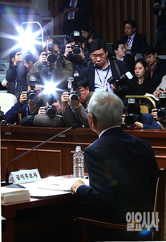 16일, 이병호 국정원장 후보자가 서울 여의도 국회에서 열린 국정원장 후보자에 대한 인사청문회에서 청문위원들의 질의에 답변하자, 사진기자들의 플래시 세례를 받고 있다.