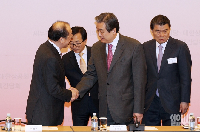 김무성 새누리당 대표가 16일 오후 서울 남대문로 대한상공회의소에서 열린 '새누리당-대한상공회의소 정책간담회'에서 참석자들과 인사를 나누고 있다.